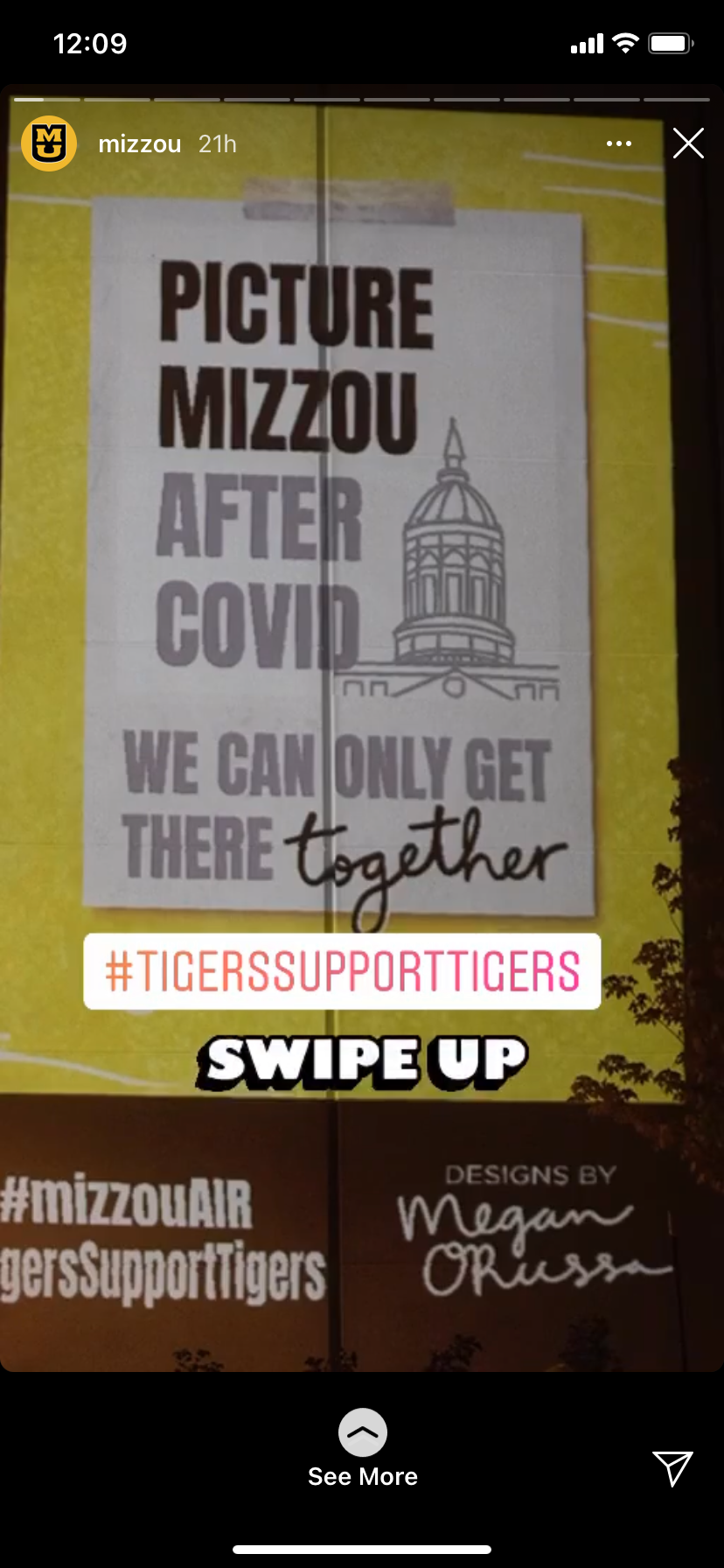 As one of three designers selected to participate in a student component of the Artist in Residence program, I was tasked to create a typographic animation to help with COVID-themed messaging as an extension of the Tigers Support Tigers campaign. Utilizing Mizzou colors, fonts, and messaging, I had one week to create an 8-second animated video that was looped and projected onto a building located on campus. Read more about the project here.